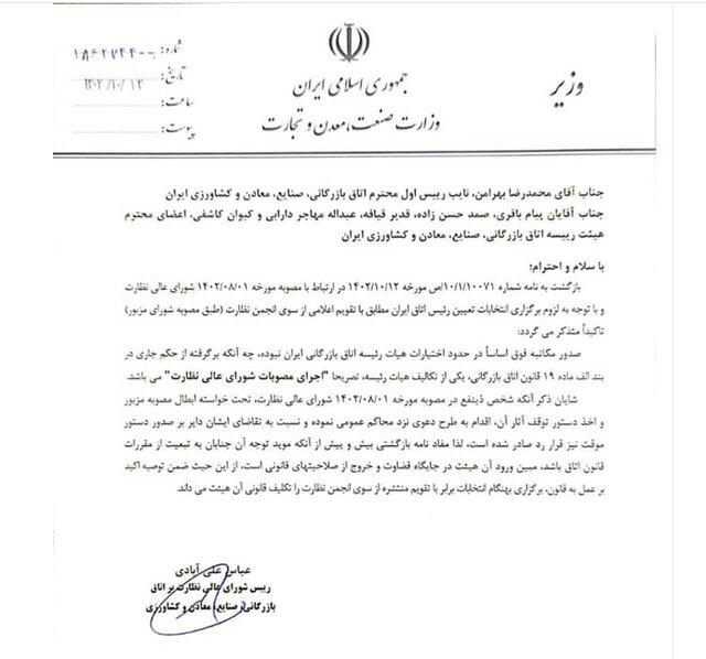 بر اساس نامه وزیر صمت به هیات رئیسه اتاق بازرگانی ایران، شکایت حسین سلاحورزی رد شد و انتخابات برای تعیین رئیس جدید اتاق بازرگانی ایران در موعد مقرر برگزار خواهد شد.